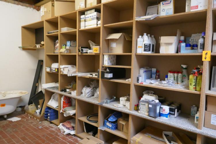 Inhoud rek : Diverse reinigingsprodukten - verfprodukten - stofzuigzakken - deursloten - scharnieren - verzorgingsprodukten - enz…( zie fotos )