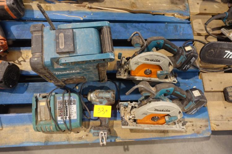 oa: 2x cirkelzaagmachine, slagmoersleutel, werfradio, lader, 2x accu