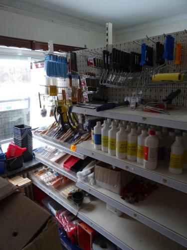 Borstel, rollen, aceton, ammoniak, bakjes, plakmessen, zoutzuur...