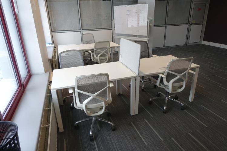 Bestaande uit 6x verrijdbare stoel, whiteboard, 2x bureauopstelling, afmetingen bureau's 2,40m & 1,60m , locatie: gate 39