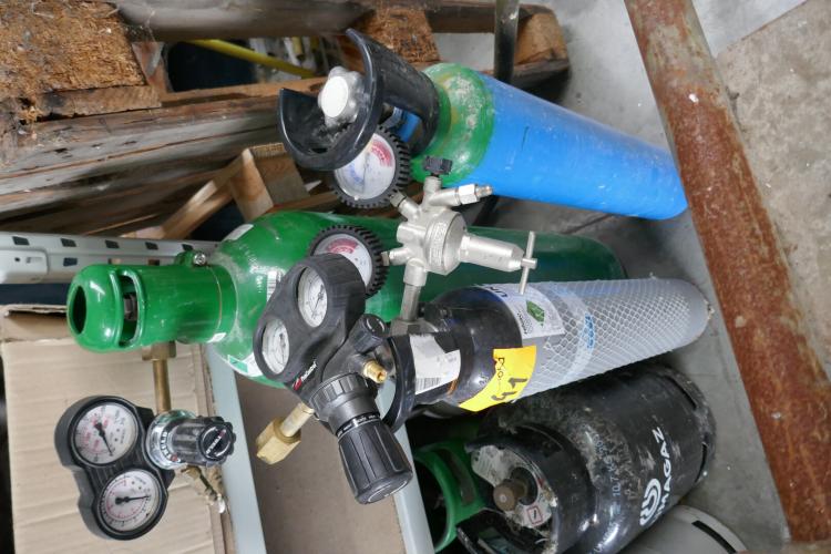 3 gasflessen met drukregelaars ( flessen zijn waarschijnlijk leeg )