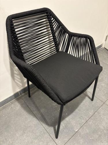 stapelbare terrasstoel met armleuning, voorzien van een afneembaar en comfortabel zwart kussen. Dankzij het lichtgewicht metalen frame, afgewerkt in antraciet, en de strakke touwstructuur oogt de stoel luchtig en modern. De schuine rugleuning en armsteunen zorgen voor een aangename zitervaring.
