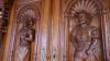 Antieken Mechelse buffetkast met houtsnijwerk (middeleeuwse figuren) + antieken houten stoel met zitting in groene stof