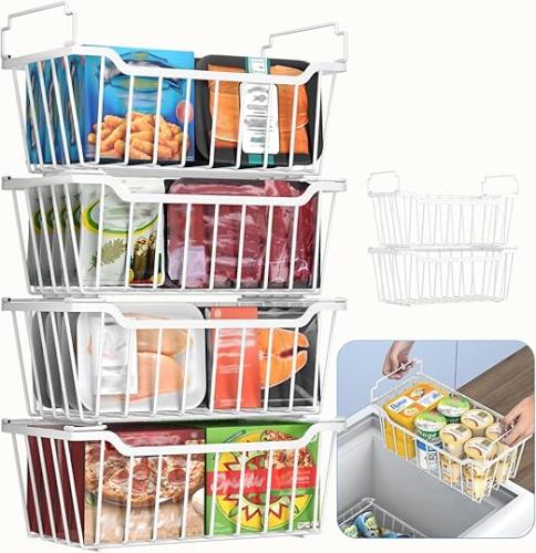 Ongebruikt, volledig, ok, WELDUN Diepvriezermanden met opvouwbare handgreep, 4-pack stapelbare organizer voor 99L 198L kleine diepvriezer, metalen opbergbakken met ruimtebenutting, wit, B0F24B3TQZ