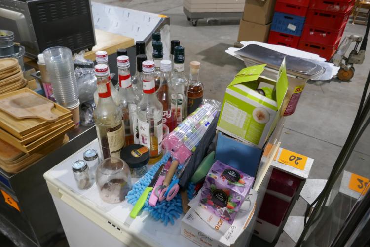 Flessen siroop - sponsjes - koffieplankjes - koffiepads - toiletpapier - snoep - enz…