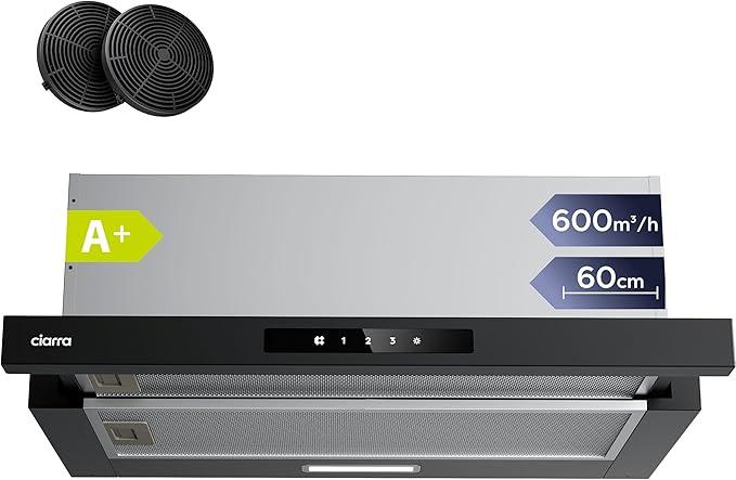 Ongebruikt, getest en werkend, volledig, ok, CIARRA CBCB6909A A+ afzuigkap (60 cm) onderbouw-600 m³/u met 3 snelheden Touchbediening-Afvoer en recirculatie afzuigkap met koolstoffilter CBCF055-Zwart, B0F3D6N1JM