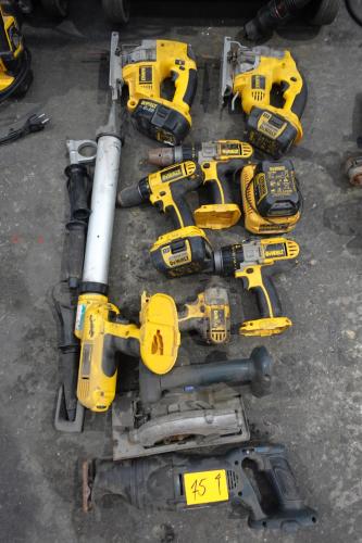 oa: 2x decoupeerzaag, 3x boormachine, kitspuit, slagschroefmachine, cirkelzaag en recipero, 4x accu en lader