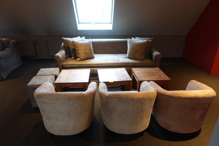 vv: 3-zit zetel , 3x kuipstoel, 3x salontafel, 2x poef