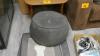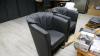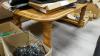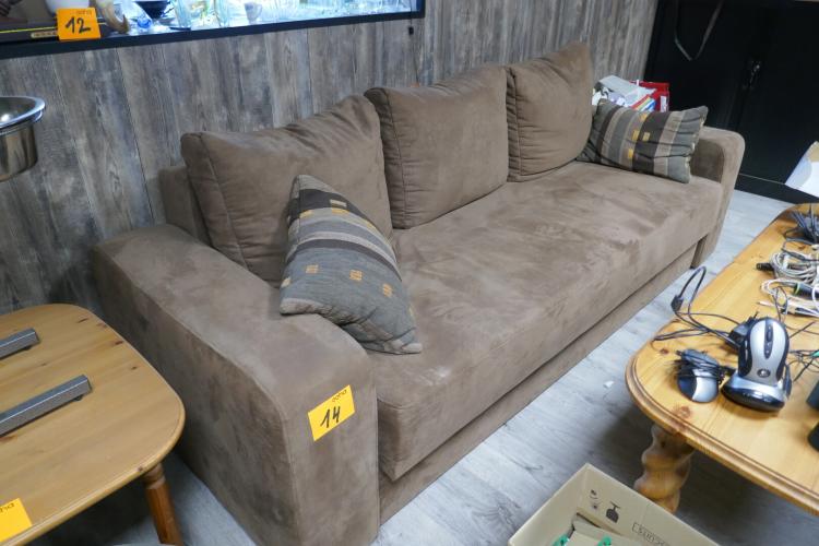 Bruinstoffen 3-zit zetel + houten salontafel + 2 clubzetels -+ bijzettafel + zitpoef + huisdiertapijt en drinkkommen