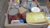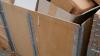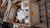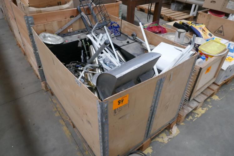 4 diverse houten palletboxen met inhoud : oud ijzer, lege en gebruikte verfpotten en lege kartonnen dozen