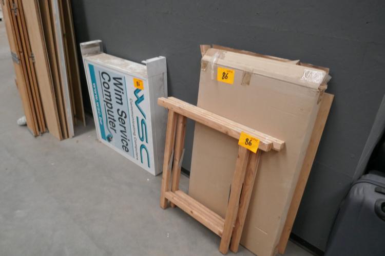 Houten schragen + haaks reclamepaneel + houten meubelplaten