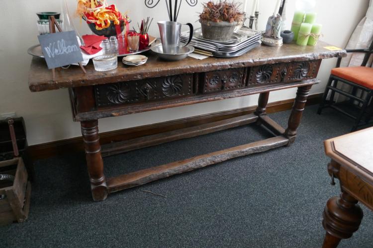 Fraaie antieken Spaanse baroktafel, met lades, prachtig dik massief houten blad, in kastanjehout