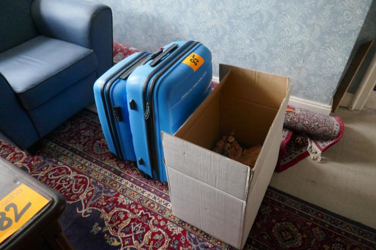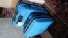 2 reiskoffers blauwe kleur + doos met vintage en antieken popjes