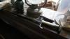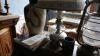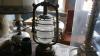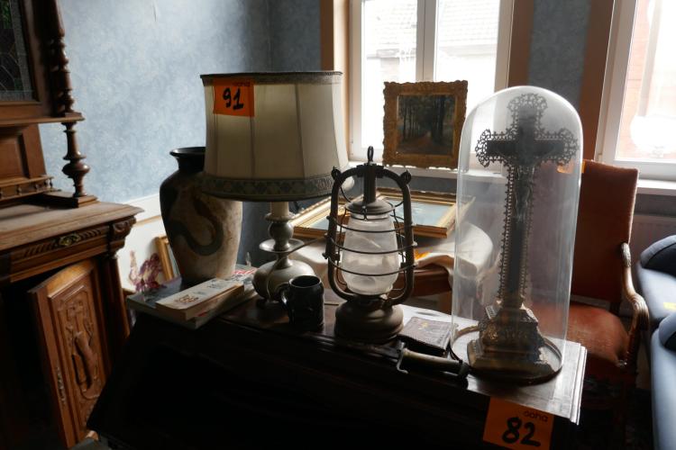 Vintage tafellamp, vaas, zwaard, boeken, kruisbeeld en olielamp