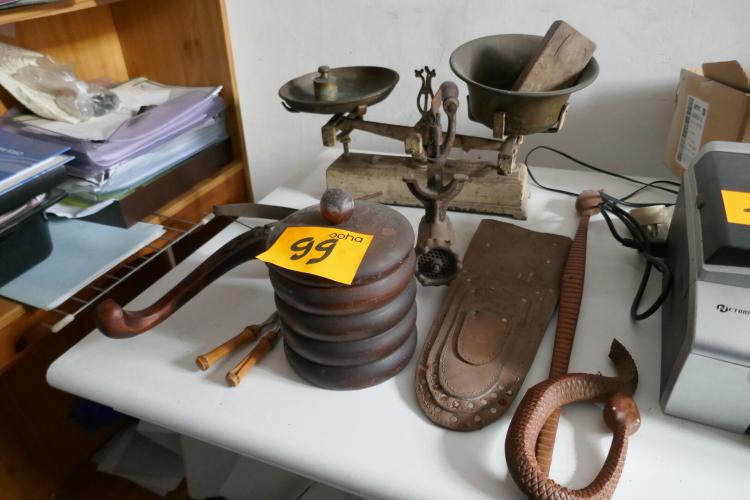 Vintage weegschaal, kruisboog, antieken tabakpot, vleesmolen enz…