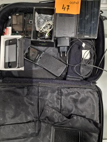 laptoptas met inhoud = diverse gsm-s en smartphones, o.a SAMSUNG, IPHONE, LG, NOKIA