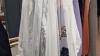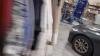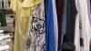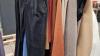 verchroomd verrolbaar kapstokrek met een 55-tal kledingsstukken voor dames, waaronder : jassen, mantels, bloezen, kleedjes,…