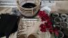 gevarieerd lot met onder meer : witte vrijstaande kapstok Thonet-stijl, buighout + kamerscherm van paulowniahout + T-light houders en potjes + fruitmand / cache-pot + etagèrehaken + mand + gordijnrails + meubelbeslag + draagzakken
