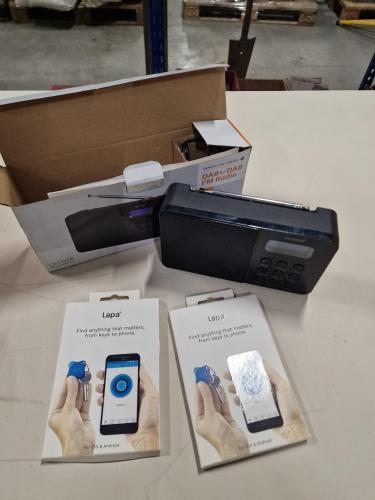 DAB+ / DAB-FM radio, merk DENVER + 2 trackers, merk LAPA (leuk technisch gadged voor aan je sleutels te hangen en zo eenvoudig terug te vinden via jouw gsm)