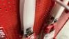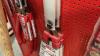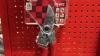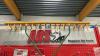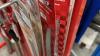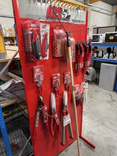 Metalen winkelrek met reeks nieuwe tuingereedschappen van het merk ARS : snoeischaren, zagen - diverse types
