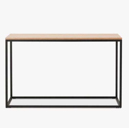 Ongeopende verpakking, wandtafel : staal gepoederlakt frame met massief eiken blad v 4cm. 120x30x75cm
