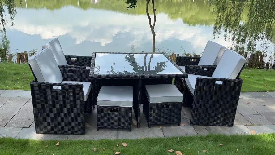 Diningset 9-delig Black wicker / witte kussens