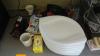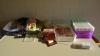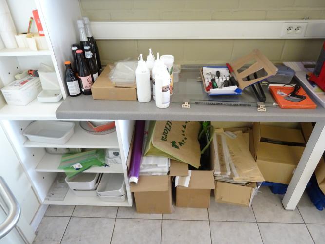 oa. borden, plastic bakjes, glazen, potten, pannen, stickers, 2x rekje, ...