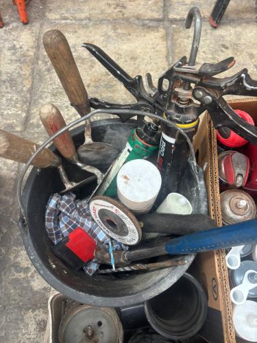Oa: koperen nagels, kitpistool, zagen, waterpas, schijven