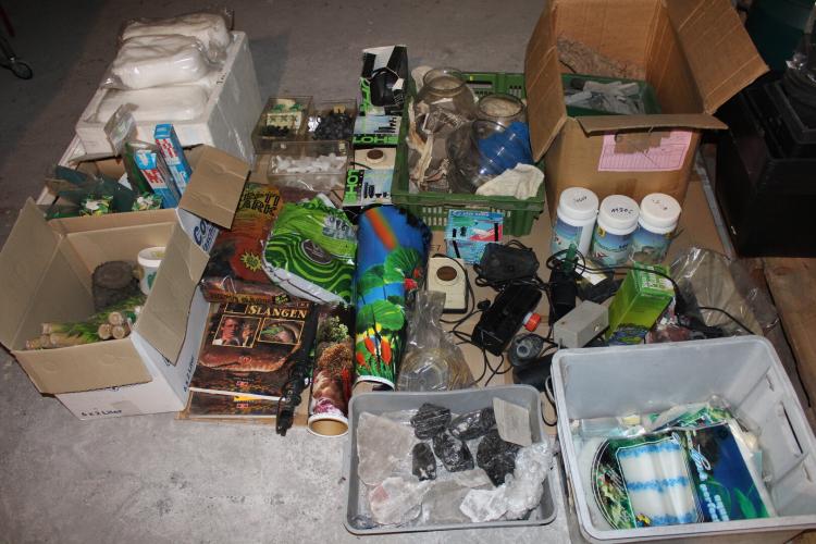 lot aquarium en reptiel benodigdheden, waaronder ; doos filterwatten,aansluitstukken,visbokalen,aquariumhout en sierstenen,transportzakjes voor vissen,rol lood voor planten,achtergrond voor aquarium,stofzuigers,ruitenkuisers,lot gebruikte filters enz,, zuurstofpompen,boeken voor reptielen,versiering voor terarriums,enzo......alles mix van nieuw en gebruikt