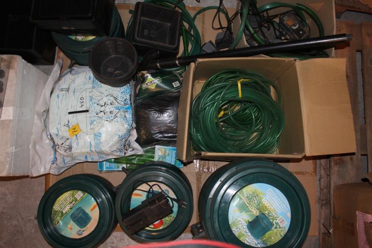 lot vijverbenodigdheden waaronder 3 kleine vijverfilters allen nieuw, assortiment plantenbakken,aantal gebruikte filterpompen,ijsvrijhouder,aansluiting voor waterstofzuiger,vijverafdeknet,2 voederringen en darmen dit is een mix nieuw en gebruikte goederen(grote filter op foto niet inbegrepen,