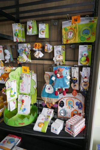 Divers baby/peuter speelgoed - ongeveer 74 stuks = knuffeldoeken - hangjig - bijtspeeltjes - buggyboekjes - speelketting - rugzak - knuffeldoek - enz… + display