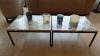 Zitbank in stof 2300x900 samen met 2x bijzettafel met natuursteen blad, 1x poef, 2x lamp, 2x bloempot