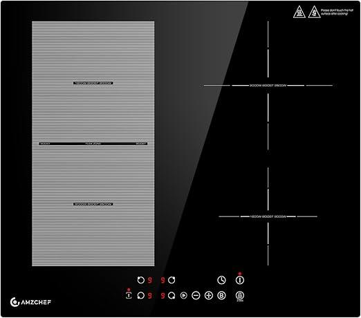 Ongebruikt, getest en werkend, volledig, ok, AMZCHEF Inbouw Inductiekookplaat 60 cm met Flex Zones, 4 zones, boostfunctie en 9 vermogensniveaus, pauzefunctie, timer, veiligheidsvergrendeling, oververhittingsbeveiliging, barbecue, 7200 W, B09339CNL8