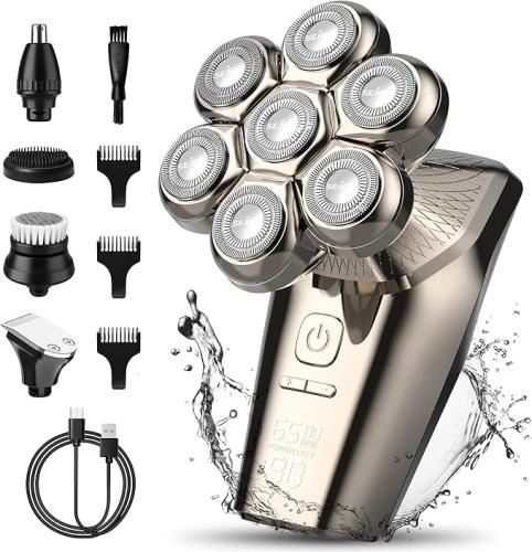 Ongeopend, Elektrisch scheerapparaat voor heren, 5-in-1, scheerapparaat met opzetstukken voor kaal hoofd, neushaar, massageborstel, scheerapparaat voor heren, oplaadbaar, IPX7, waterdicht, led display, scheerapparaat voor heren, B0BRKHXJBL