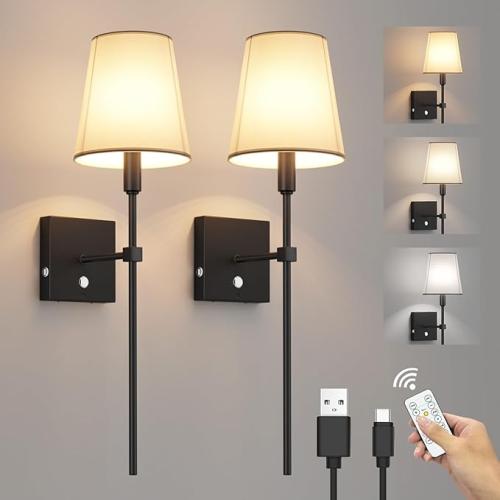 Ongeopend, ok, Coinmit 2 Stuks Draadloze Wandlamp met Timer en Afstandsbediening - 6000 mAh Oplaadbare Batterij, Dimbare Zwarte Touch-lamp met Stoffen Kap voor Binnen, B0DGTKY859