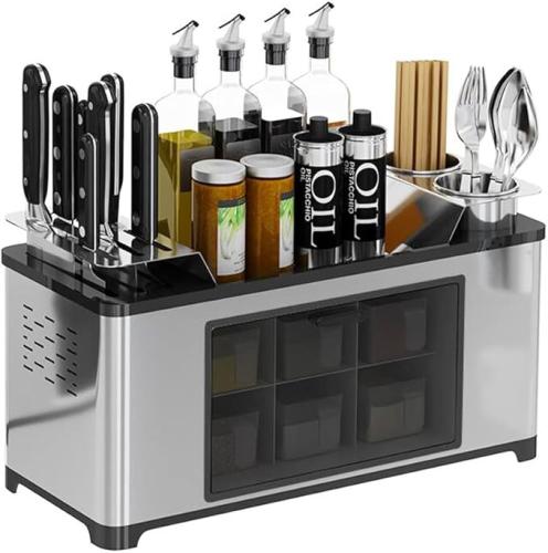 Ongeopend, exclusief materiaal, Umi Kitchen Rack Worktop Spice Rack Spice Box Shelf Cans Bottle Storage Jars Spice Container Knife Holder Chopsticks Caddy - 43x20x17,5cm, Stainless Steel, Silver , B08DNLFPRP