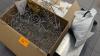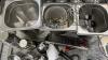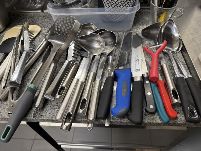 snijplanken, gastronormbakken, messenhouder, messen, pollepels, spatels, en dergelijk keukengerief + doos met o.a. frietzakhouders + kartonnen puntzakken + verlekbak + frietzeef