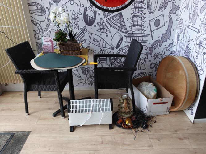 oa: tafel , 2 stoelen , planten , verwarming , verlichting , ...