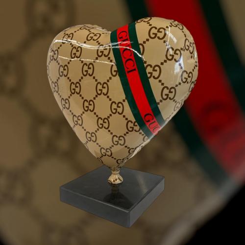 Waardering expert : € 800 - Een high-end interieurobject van het gerenommeerde Nederlandse kunsthuis Cobra Art - Komt met COA - Dit sculptuur combineert de speelse vorm van een ballon-hart met de allure van haute couture - De strakke, hoogglans afwerking en het iconische patroon (een artistieke knipoog naar het Gucci-design) maken dit tot een luxe statement piece dat direct sfeer brengt in een modern interieur - Het kunstwerk "The Balloon Heart Gucci tribute" van Naor is in een speciale editie uitgegeven door Cobra Art Amsterdam, gevestigd vlakbij het Rijksmuseum en het Van Gogh Museum - Afmetingen 27 x 33 x 15 cm.
