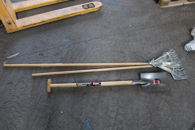 Plm 3 stuks, Ongebruikt, Partij tuinmateriaal, 1 x PROF.SPADE 280/180/3 T-ST 95CM, 1 x BLADHARK KUNSTSTOF VAST 380MM M/ST 1,5M, 1 x BLADHARK VERSTELBAAR 22T/410MM M/ST 1,5M