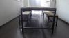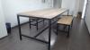 Metalen tafel met houten blad(2600x900x760) bijpassende bankjes(120x380x450) 2x dossierkast+ inhoud met sleutel, bureaukastje