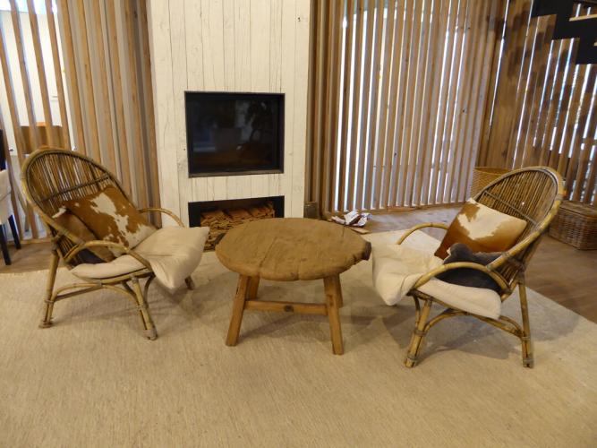 2 rieten stoel + houten salontafel dia 830x500+ tapijt 3500x2500
