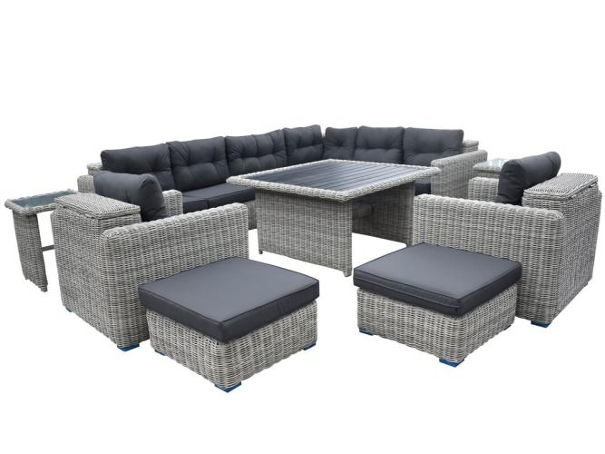 Loungeset 11-delig lichtgrijs rond wicker / donkergrijze kussens met opbergvak