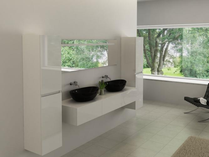 Badkamermeubel BAVENO | 180 cm | Met zijkasten | Hoogglans wit met 2 zwarte waskommen | Incl. kranen