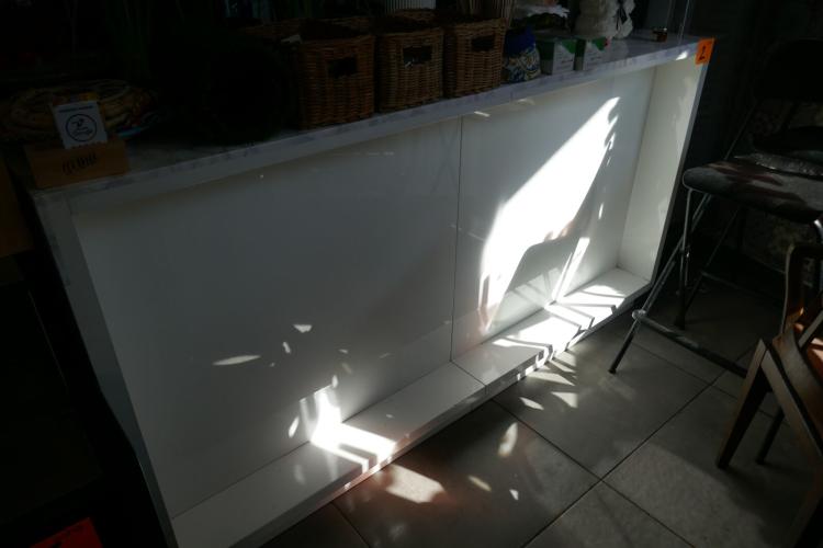 Houten toonbank witte kleur + inhoud : verpakkingsmateriaal en dergelijken