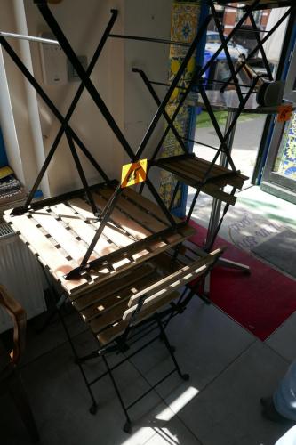 2 bistrotafels en 4 bistrostoelen + hoge metalen ronde tafel (vast te zetten ) + 2 vouwbare barkrukken