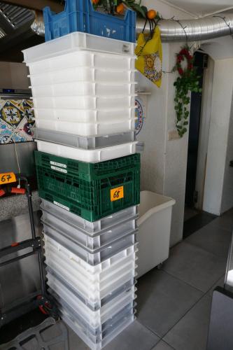 Reeks diverse plastieken bakken + verrijdbare plastiek bak voor tarwebloem