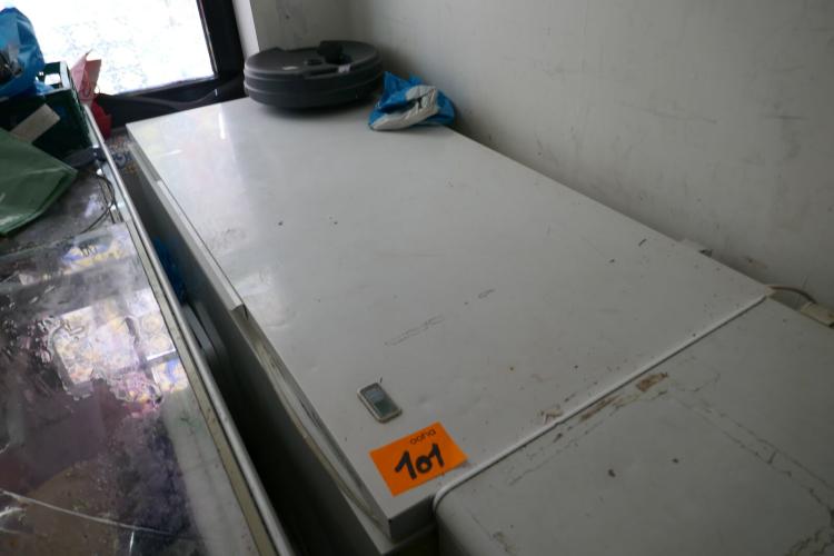 Vrieskist met deksel witte kleur + inhoud : bevroren voedingswaren (graag te bezichtigen )