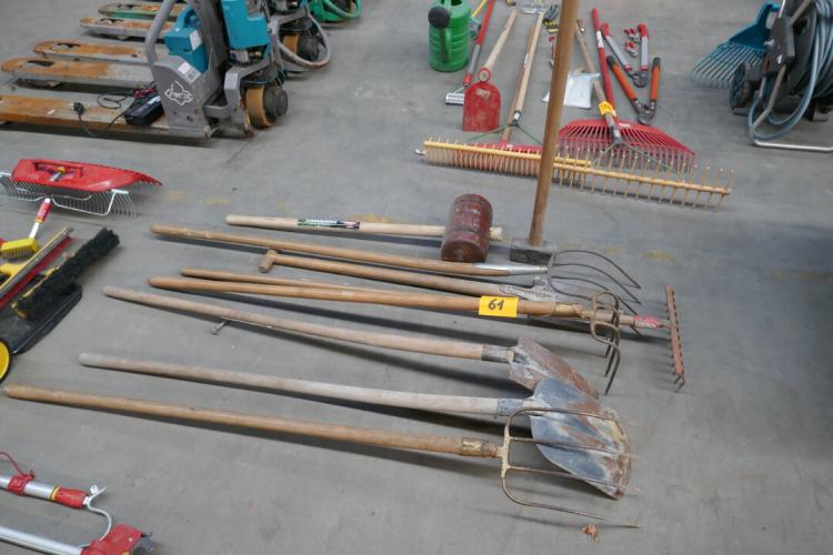 Landbouwgereedschap : hooivorken - spitvork - hooihark - houten hamer - schoppen - enz..