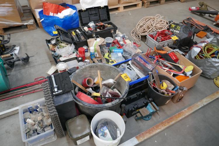 Werkmateriaal en dergelijken : bankschroef - verstekbak - werkmateriaal - bevestingsmateriaal - gereedschapskoffers - kniematten - digitale schuifmeter - stukadoormateriaal - pluggen - spuitbussen - enz…( zie foto's )